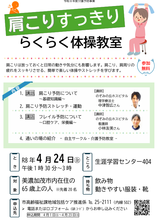 | 日時 | 1回目 令和8年 4月24日(金) 13:30~15:00 2回目 令和8年 6月26日(金) 13:30~15:00 3回目 令和8年 10月28日(木) 13:30~15:00 4回目 令和8年 12月23日(水) 13:30~15:00 |